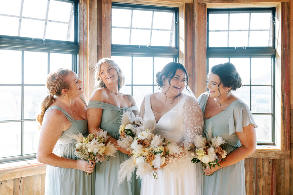 The bridal bouquet featured a stunning blend of toffee and cappuccino roses, ivory blooms, and pampas accents for volume and texture. Simultaneously, the bridesmaids carried smaller, coordinating bouquets that paired beautifully with their sage green dresses. Together, the bridal party radiated joy, with their soft palettes and genuine smiles lighting up the rustic barn backdrop.