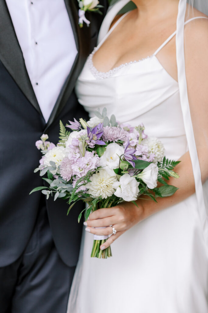 There’s something undeniably elegant about a bouquet built around soft shades of purple. It’s romantic without feeling overly sweet, timeless yet still fresh, and perfect for brides who want a little color while keeping things airy and refined. Today, we’re breaking down one of our favorite purple-and-white bouquets featuring light purple stock, clematis, China asters, white lisianthus, and dreamy dahlias.
